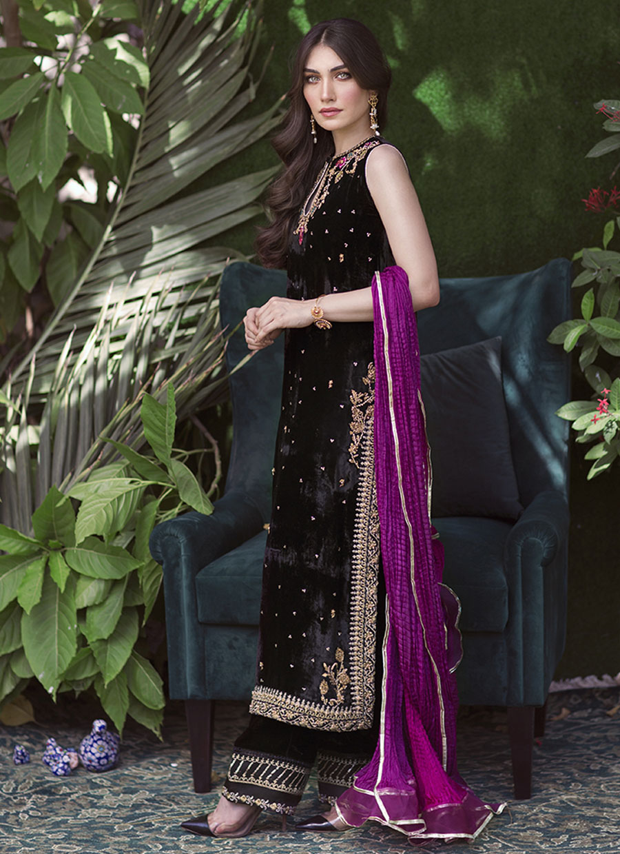 A gorgeous, deep black velvet shirt with an intricately embellished neckline in gold and silk-thread work in shades of emerald, fuschia and magenta. The stunning back has a lovely detailed neckline, sure to make an impact at any event this festive season. Pair your outfit with our delicately embellished velvet izaar and statement earrings for an effortlessly chic look.