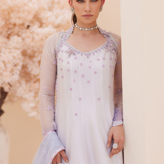 Nothing truly, captures FTA’s feminine, romantic aesthetic more than a romantic, effortlessly flowing kalidaar. Cut from pure silk, this gorgeous ensemble, will be your perfect solution for any and every special occasion. Hand encrusted with an array of delicately shimmering Swarovski crystals, pearls and sequins on the front and back necklines. The sleek glamourous sleeves, cut from organza have a subtle ombre effect and are edged with a beautiful scalloped lace. An airy organza dupatta, finished with a swirly frill adds a distinctly elegant flair to your final look. Pair your ensemble with our pure silk, embroidery trimmed wide leg pants and some statement earrings for that uber-chic, polished vibe.