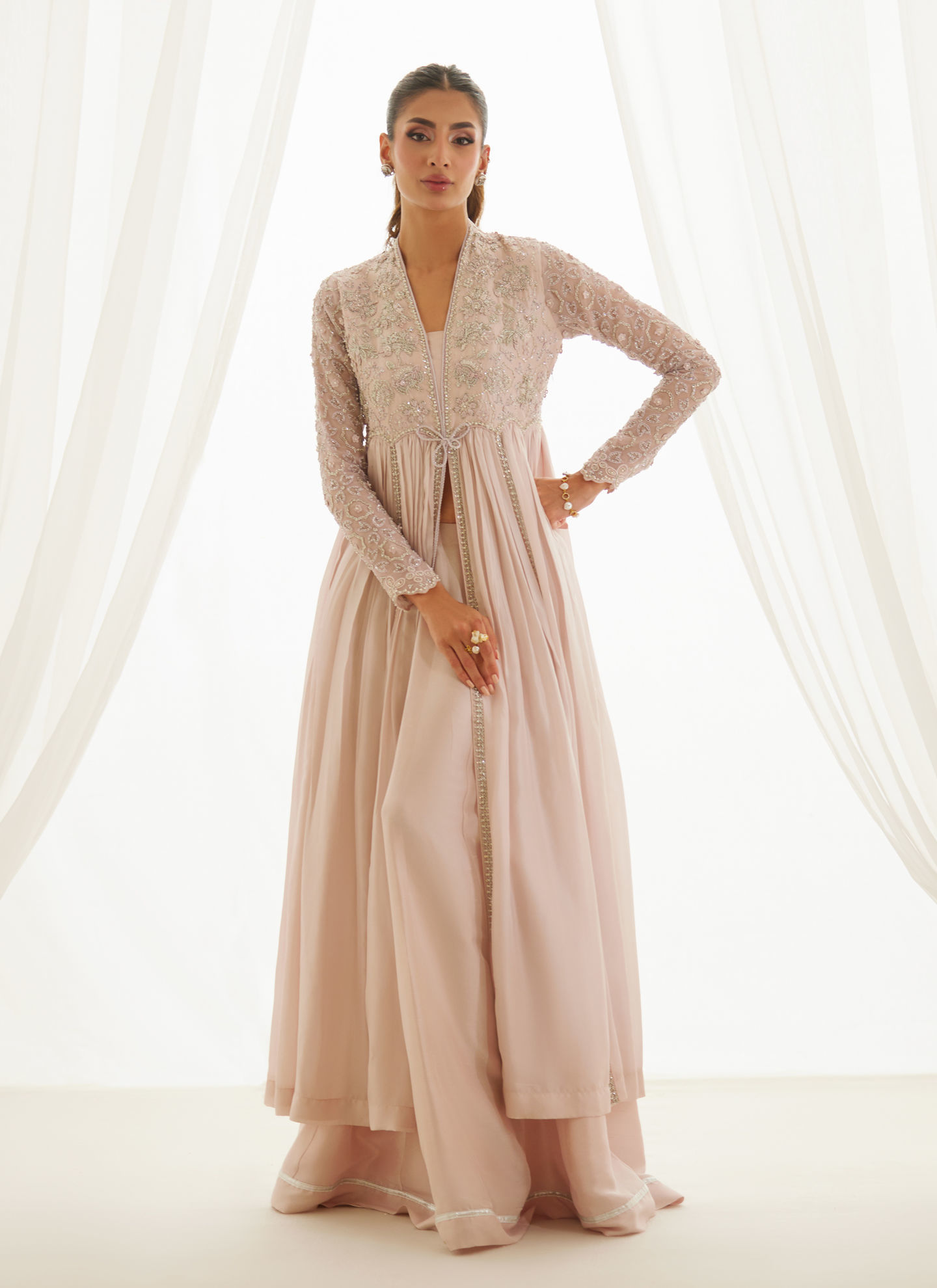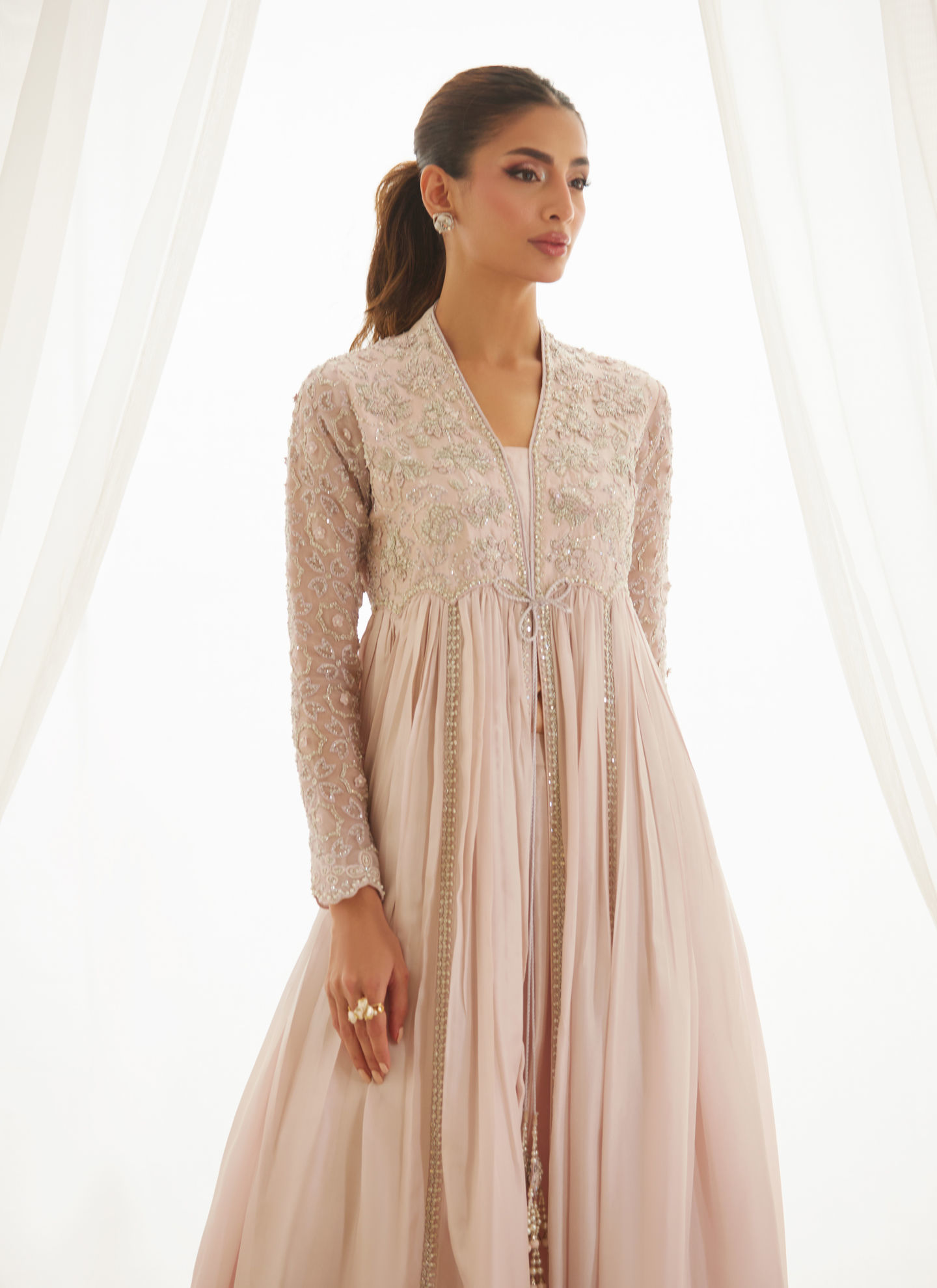 Endlessly chic and undeniably glamorous, this kalidaar is your ultimate style solution. Cut from pure raw silk in a pale blush pink, the flowing silhouette is brought to life with delicate coordinating threadwork and silver, pearl, and bead embellishments. The intricately handworked bodice is designed to command attention, making it the ultimate statement for day or night. Paired with a striking lehenga, this fail-safe ensemble promises to make you the belle of the ball.