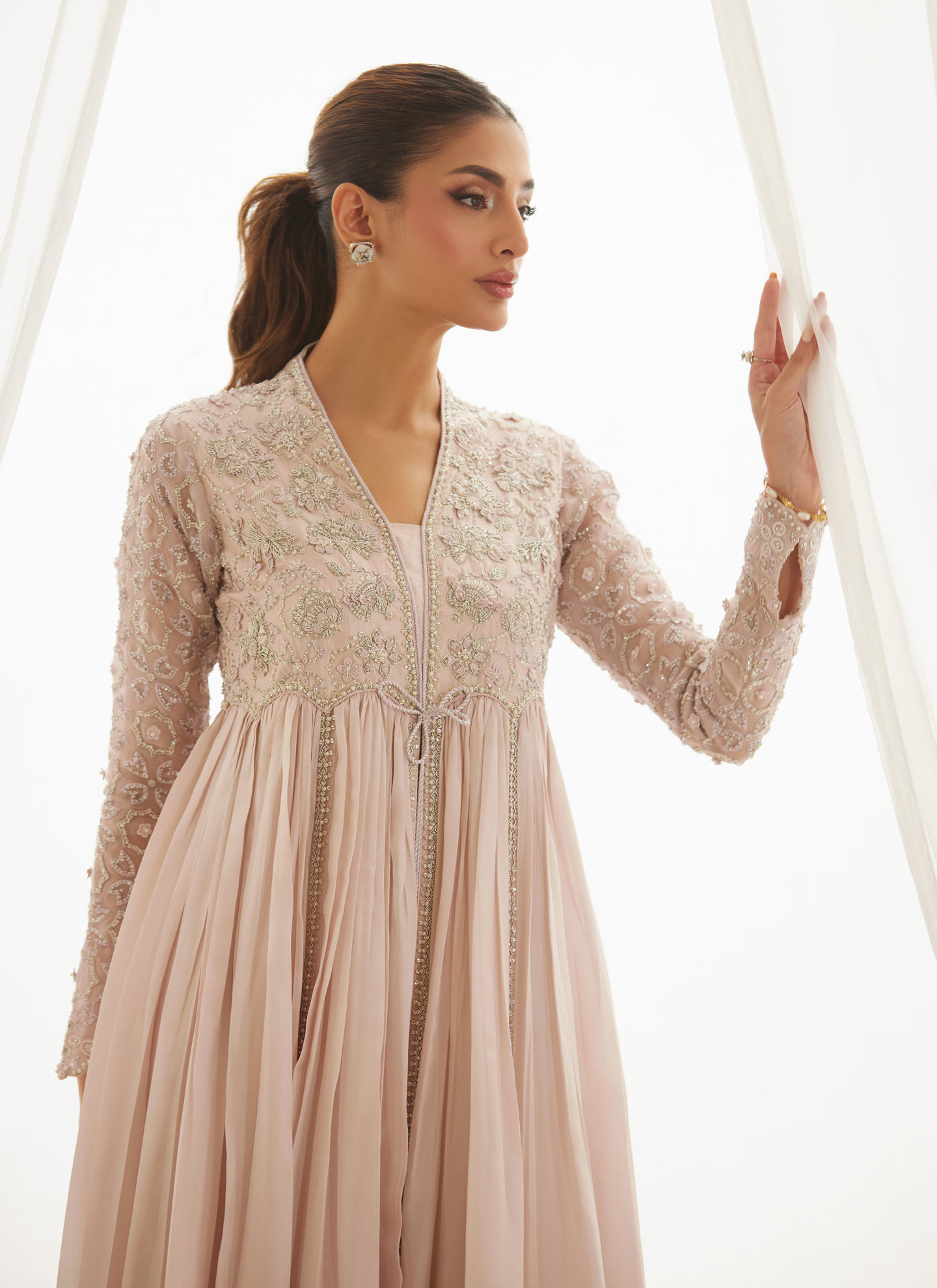 Color: Misty Pink Fabric: Kalidaar: Pure Raw Silk With Hand Embellishments, Optional Pairing: Coordinating Lehnga